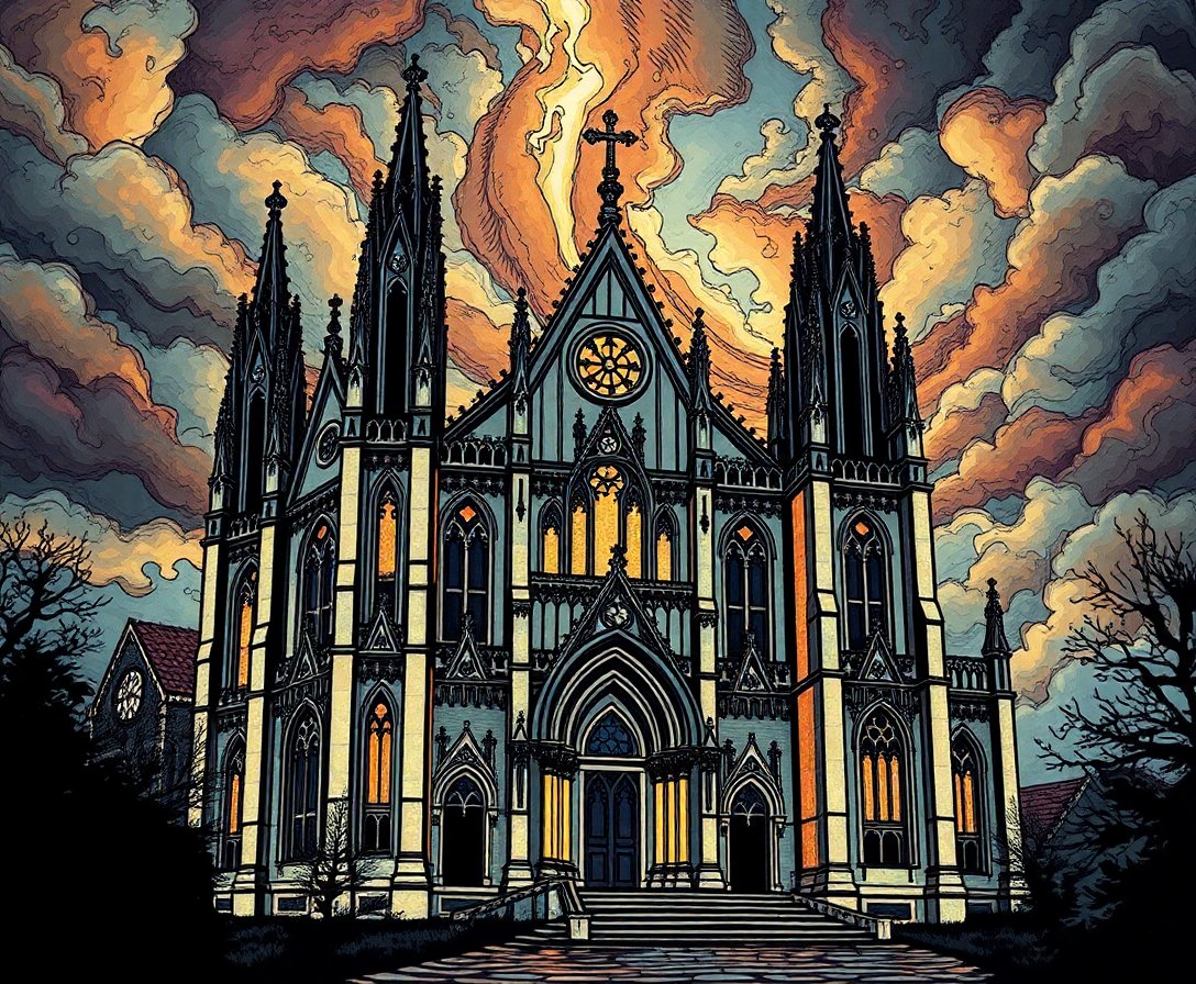 Subsequently, begin with lighter sepia tones to establish the tempest’s ethereal background. Moreover, gradually layer deeper shadows around the basilica’s intricate stonework. Each brushstroke brings this Gothic architecture masterpiece closer to completion.