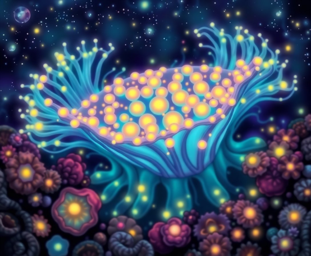 This design combines scientific accuracy with vintage aesthetic appeal, showcasing the Atolla jellyfish’s unique bioluminescent properties. The contrast between dark depths and glowing features creates a truly mesmerizing piece.
