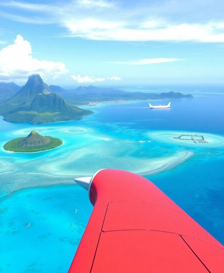 This nostalgic perspective captures Bora Bora’s stunning atoll from above, creating a unique vintage travel poster aesthetic. The design evokes classic Polynesian tourism imagery with timeless appeal.