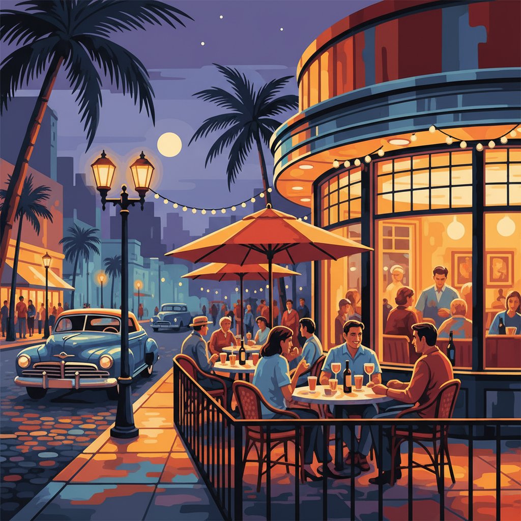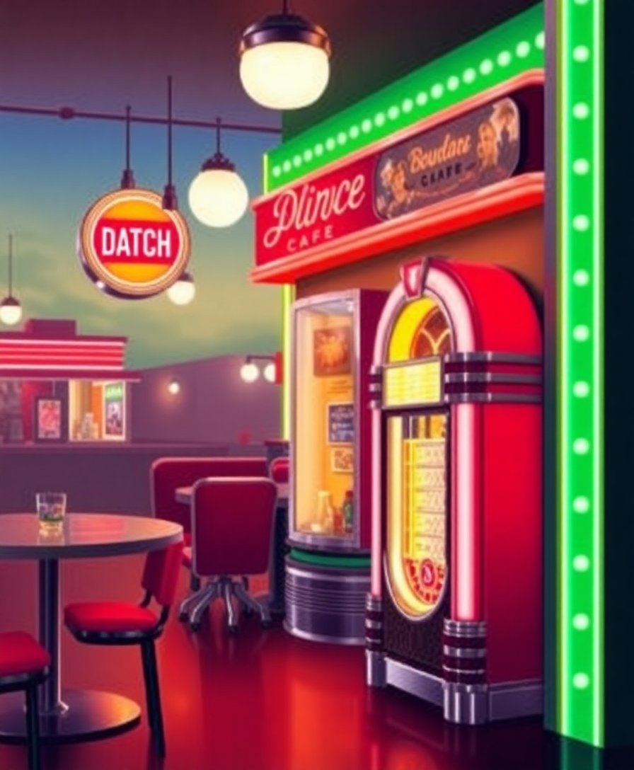The authentic boulevard cafe atmosphere captures classic Americana with realistic twilight lighting effects. The glow elements add depth and warmth reminiscent of golden-era diners.