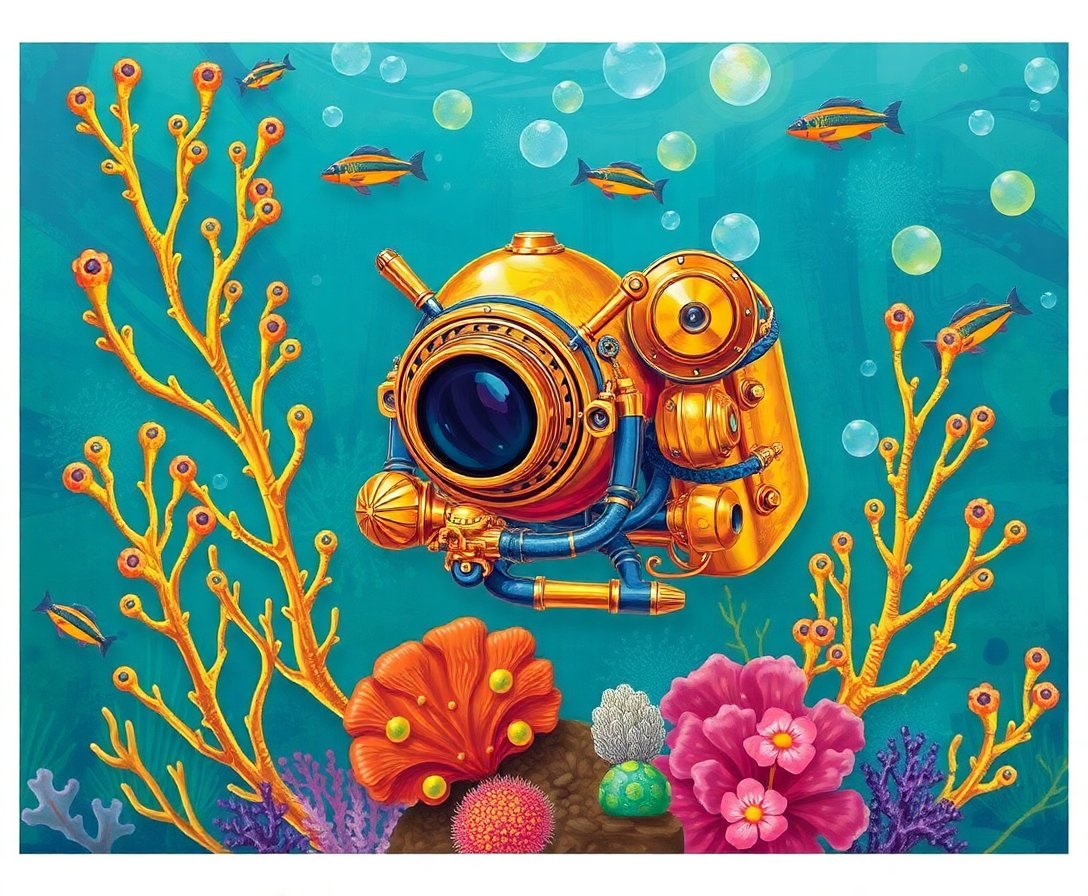 Ultimately, step back and admire your completed oceanic scene. The vintage brass helmet gleams among vibrant coral formations. Additionally, your finished artwork captures the mysterious beauty of deep sea exploration perfectly.