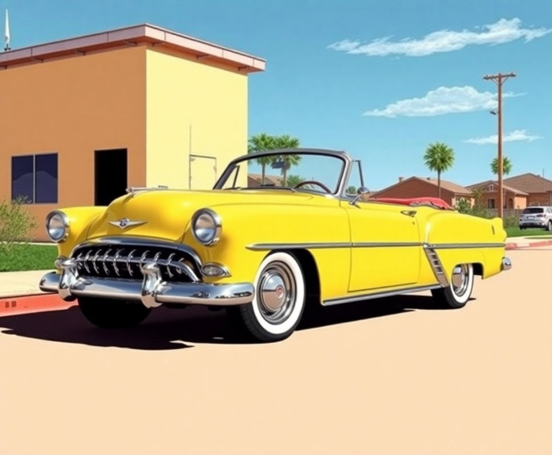 The design features authentic mid-century architectural elements with sophisticated pastel shadows. The geometric composition creates visual depth while maintaining the nostalgic charm of vintage automotive spaces.
