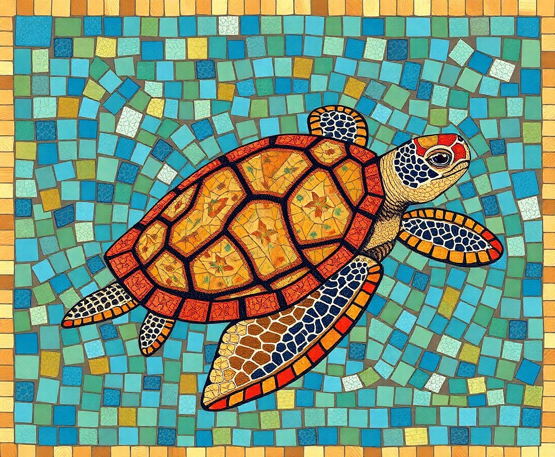 Ultimately, step back and admire your completed vintage masterpiece. The sea turtle’s intricate mosaic details showcase your artistic accomplishment. Frame your finished work to display this stunning historical tribute.