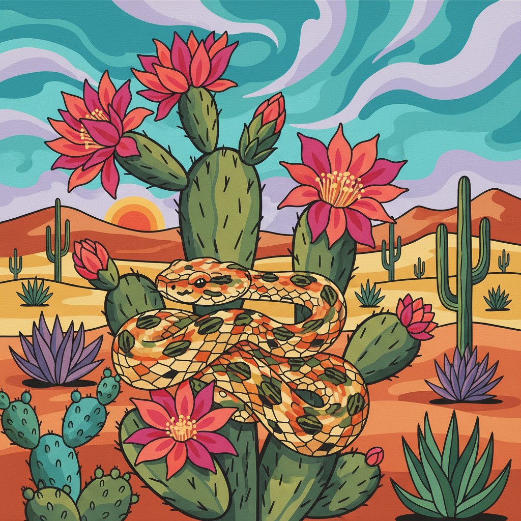 Transform your space with this captivating Vintage Cactus Viper Bloom Paint By Numbers design. This unique botanical masterpiece combines the mystique of desert reptiles with stunning floral elements. Experience the meditative joy of creating your own vintage-inspired artwork.