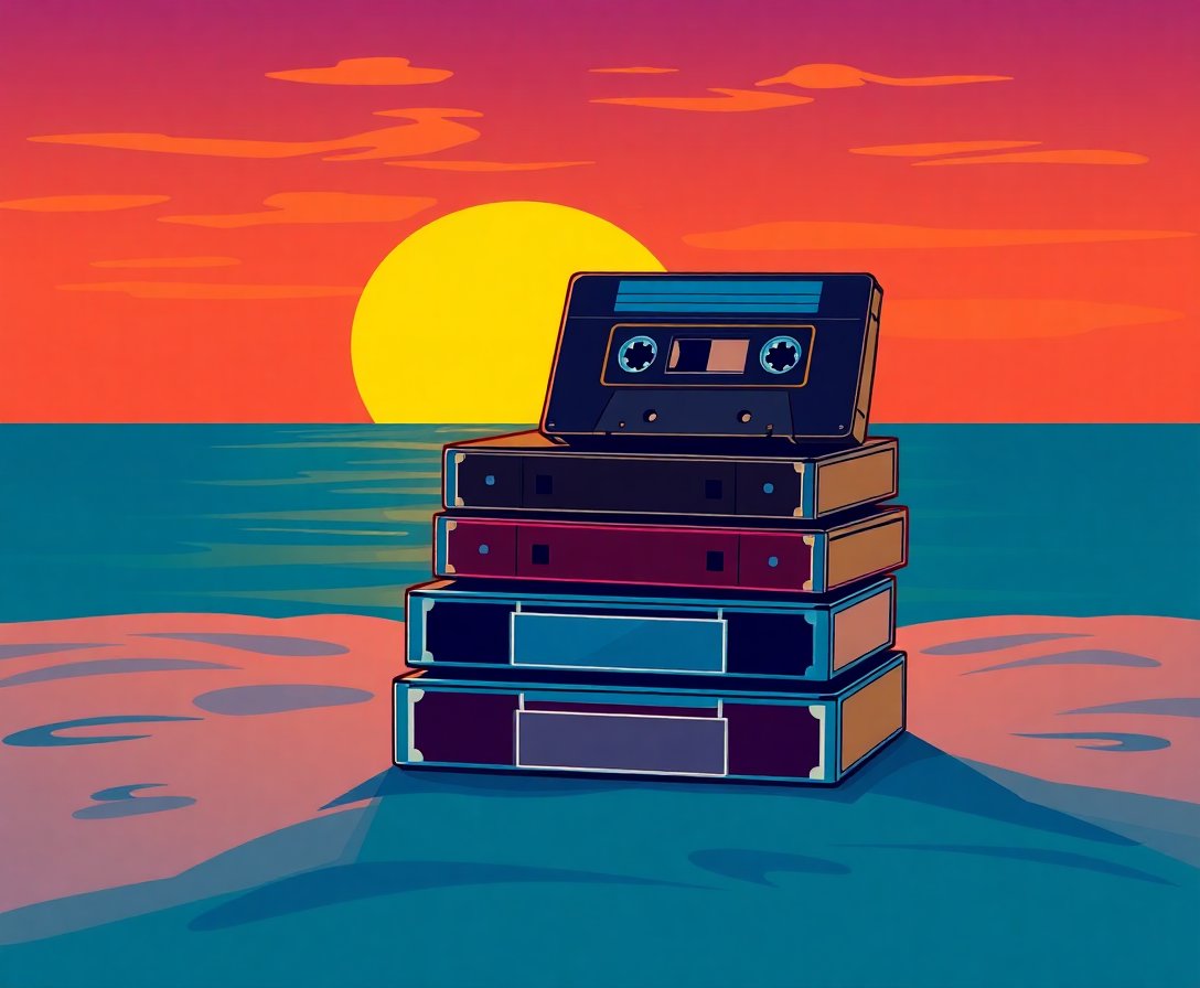 Ultimately, step back and admire your completed retro artwork. The sunset backdrop perfectly complements the stacked cassettes. Your finished piece celebrates the beauty of analog music culture.
