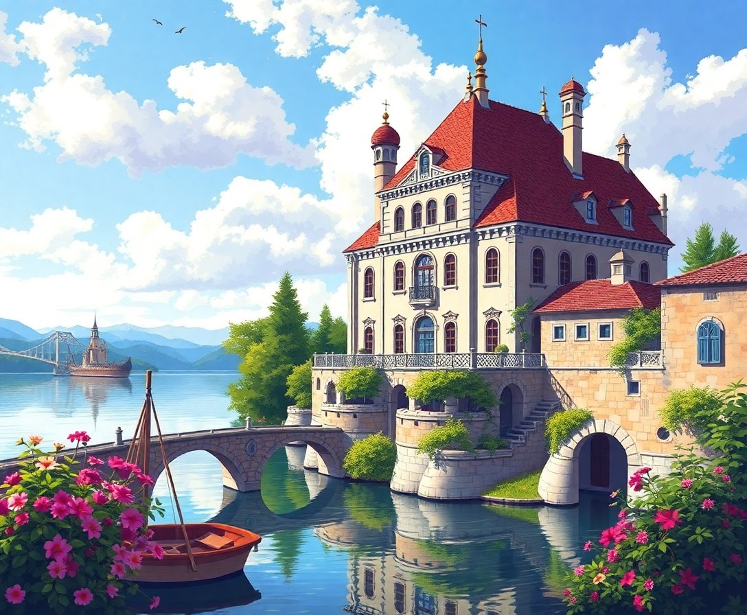 Ultimately, complete the lagoon’s reflective waters and surrounding foliage details. Add final touches to enhance the vintage romantic atmosphere. Your finished masterpiece will showcase the castle’s majestic beauty perfectly reflected in serene waters below.