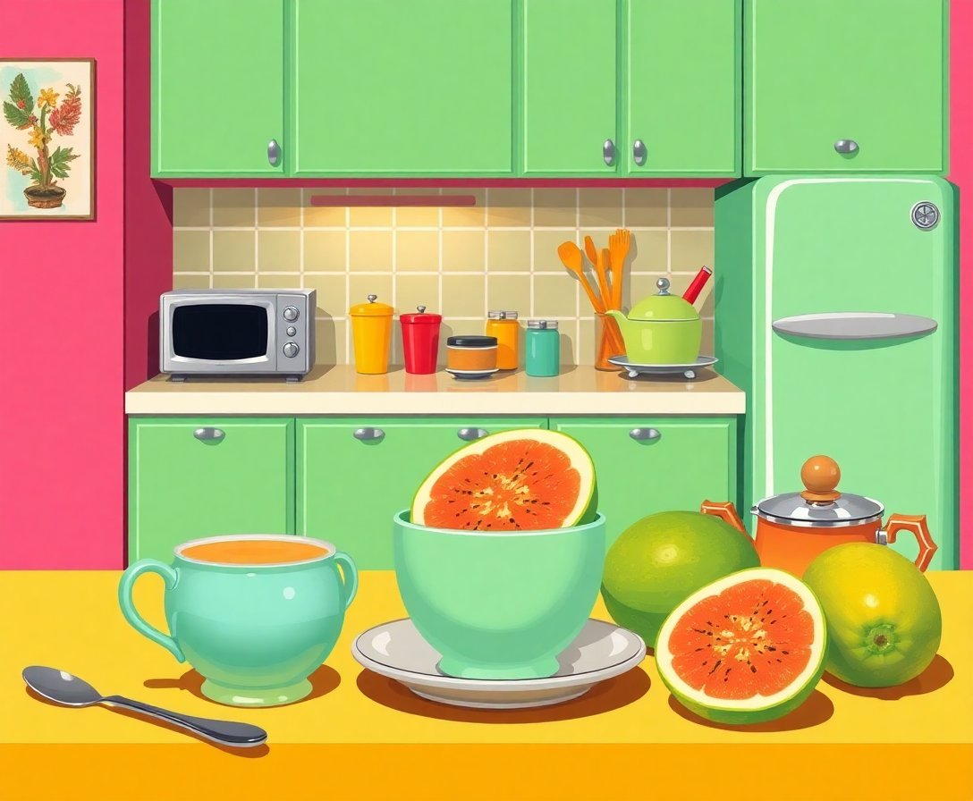 Transform your creative space with this enchanting Vintage Chrome Guava Breakfast Paint By Numbers kit. This nostalgic masterpiece captures the warm essence of retro kitchen charm. Experience the joy of recreating chrome reflections and vibrant guava tones in this delightful breakfast scene.