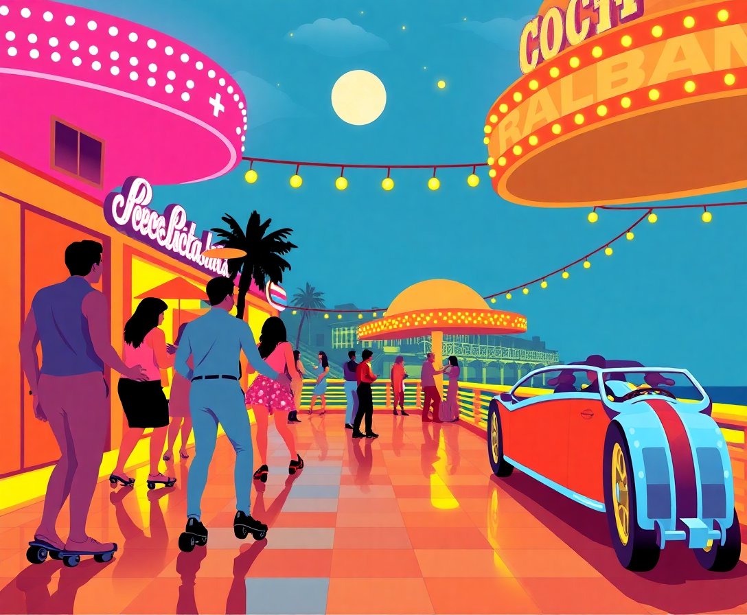 Experience the magic of vintage Copacabana roller culture through this therapeutic painting journey. Create lasting memories while crafting a stunning piece that celebrates the golden era of roller skating nightlife.