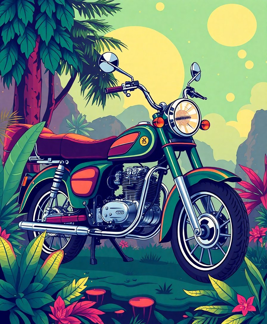 This unique design combines retro scooter aesthetics with mystical jungle and cosmic elements, creating a one-of-a-kind artwork that celebrates both vintage culture and sci-fi imagination.