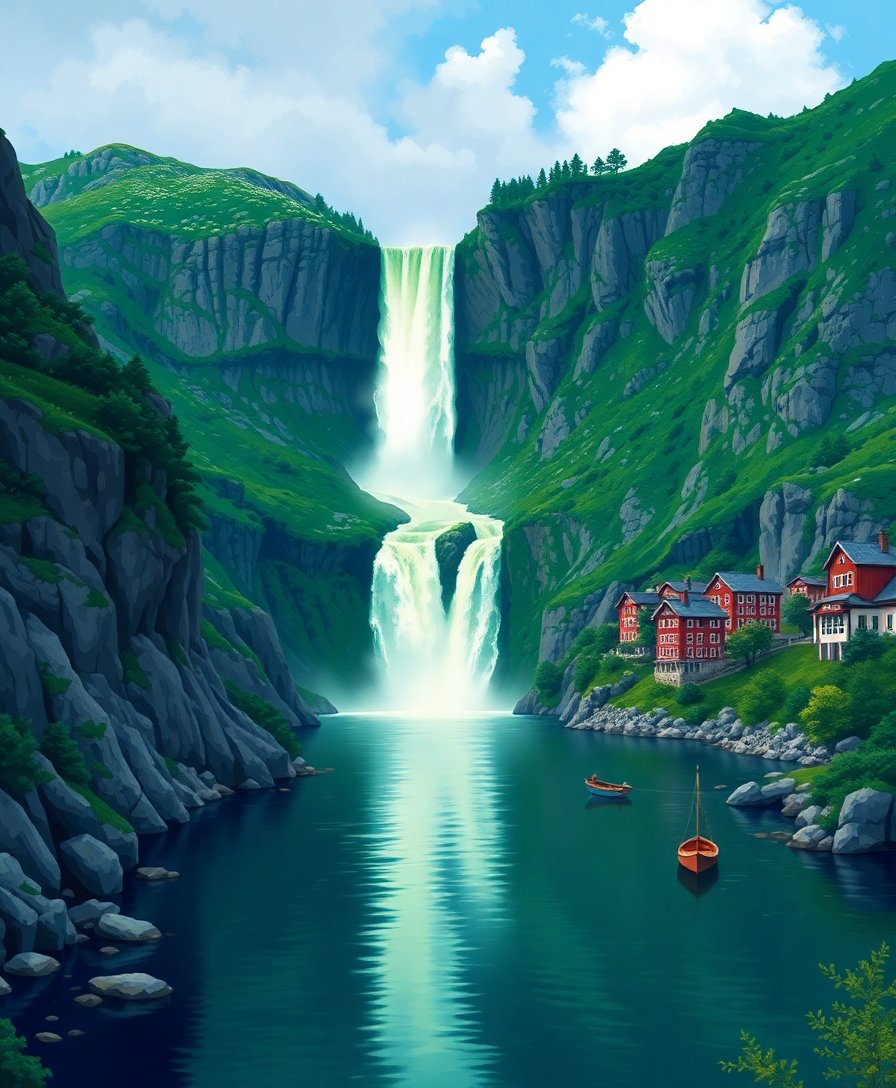 The completed painting measures perfectly for home display, creating an impressive focal point that showcases the emerald fjord’s natural beauty and vintage charm.