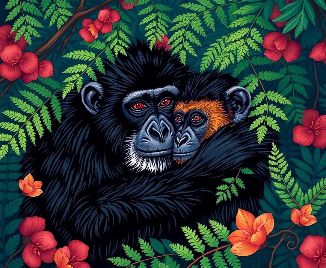 This unique design celebrates the tender relationship between chimpanzees and their environment. Furthermore, the vintage aesthetic adds timeless appeal to any space. Additionally, the giant ferns create a lush backdrop for the touching primate scene.