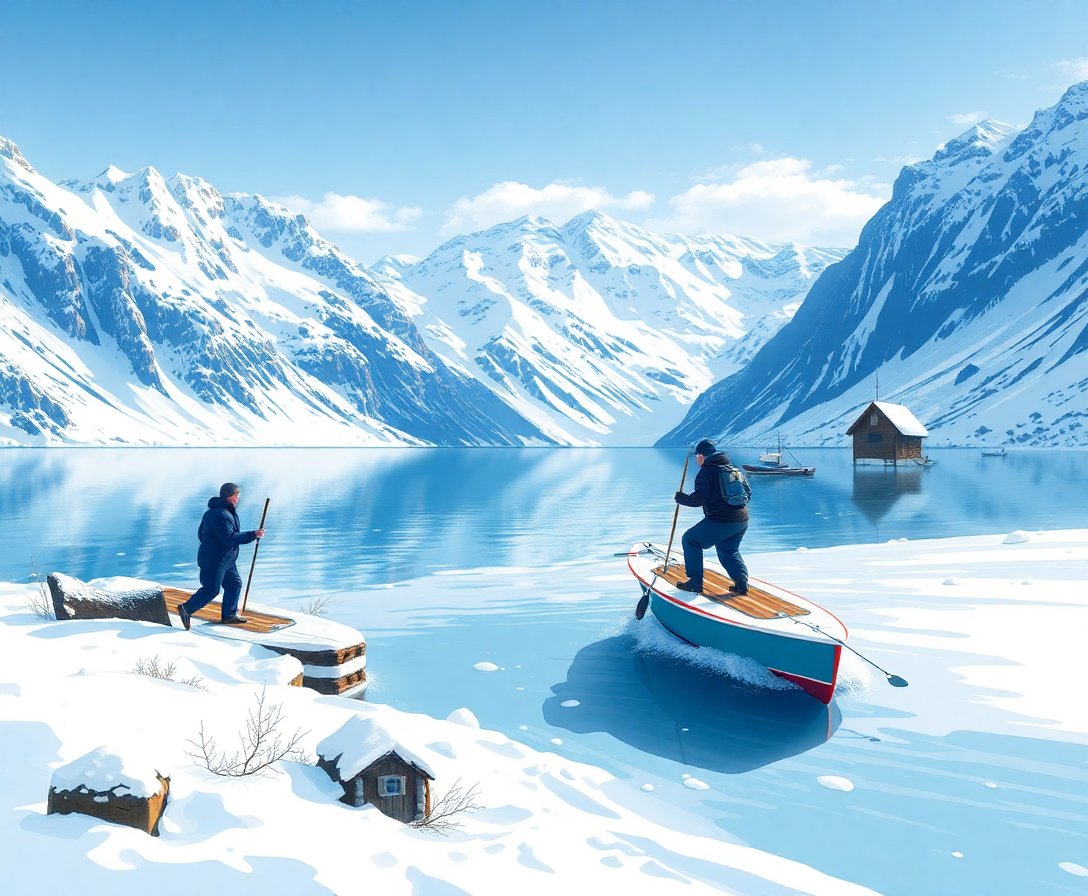 The sepia-toned artwork captures the unique beauty of winter surfing in snow-covered fjords. This nostalgic scene combines adventure with artistic elegance.