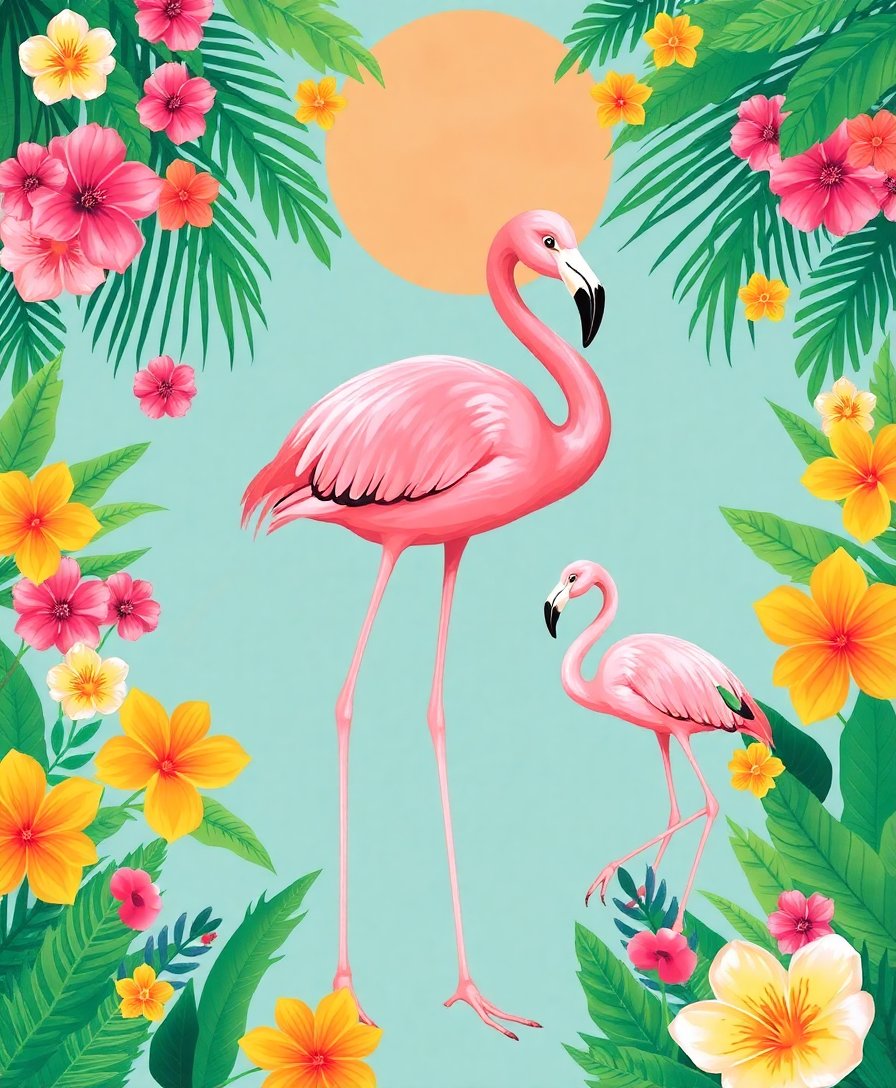 Ultimately, step back and admire your completed tropical scene. The finished piece showcases vibrant flamingos amid lush florals. Moreover, your artwork is ready for display or gifting.