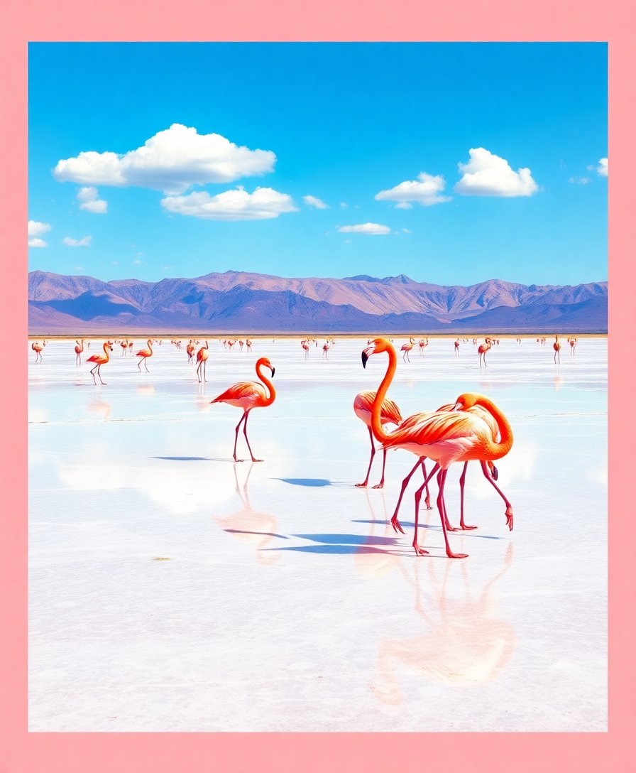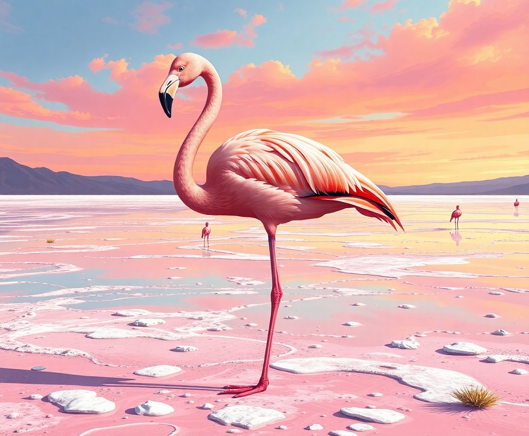 Ultimately, step back and admire your completed vintage flamingo masterpiece. Additionally, the final touches bring the salt flats reflection to life. Your finished artwork captures the tranquil beauty of these majestic birds in their natural desert oasis environment.