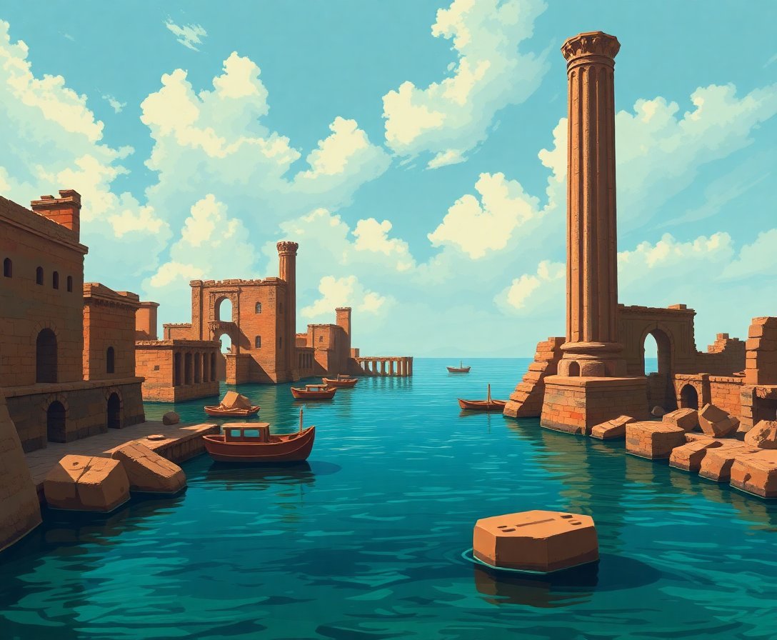 The vintage sepia tones and underwater atlantis theme create a unique atmospheric piece. The flooded pillars and mysterious harbor setting offer an escape into ancient mythology.