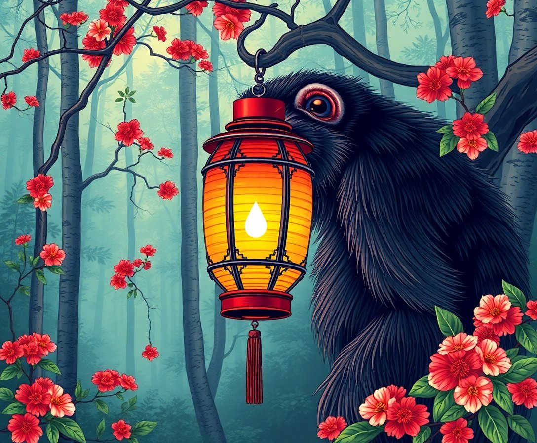 This unique artwork captures the mystical atmosphere of Edo period forests with authentic cultural details. The primate subject and lantern symbolism reflect traditional Japanese artistic themes beautifully.