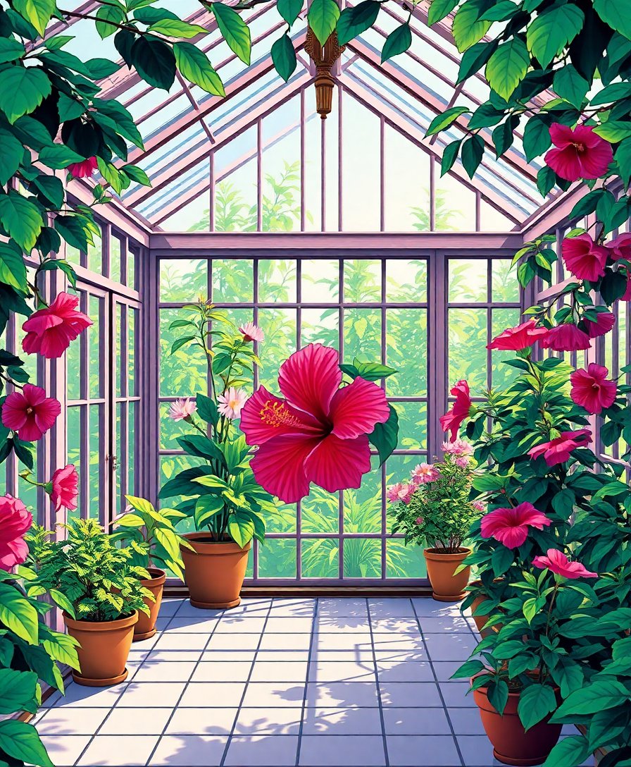 Ultimately, watch your vintage glasshouse scene come alive with each completed section. The finished piece showcases vibrant hibiscus blooms that capture the essence of a peaceful conservatory moment.