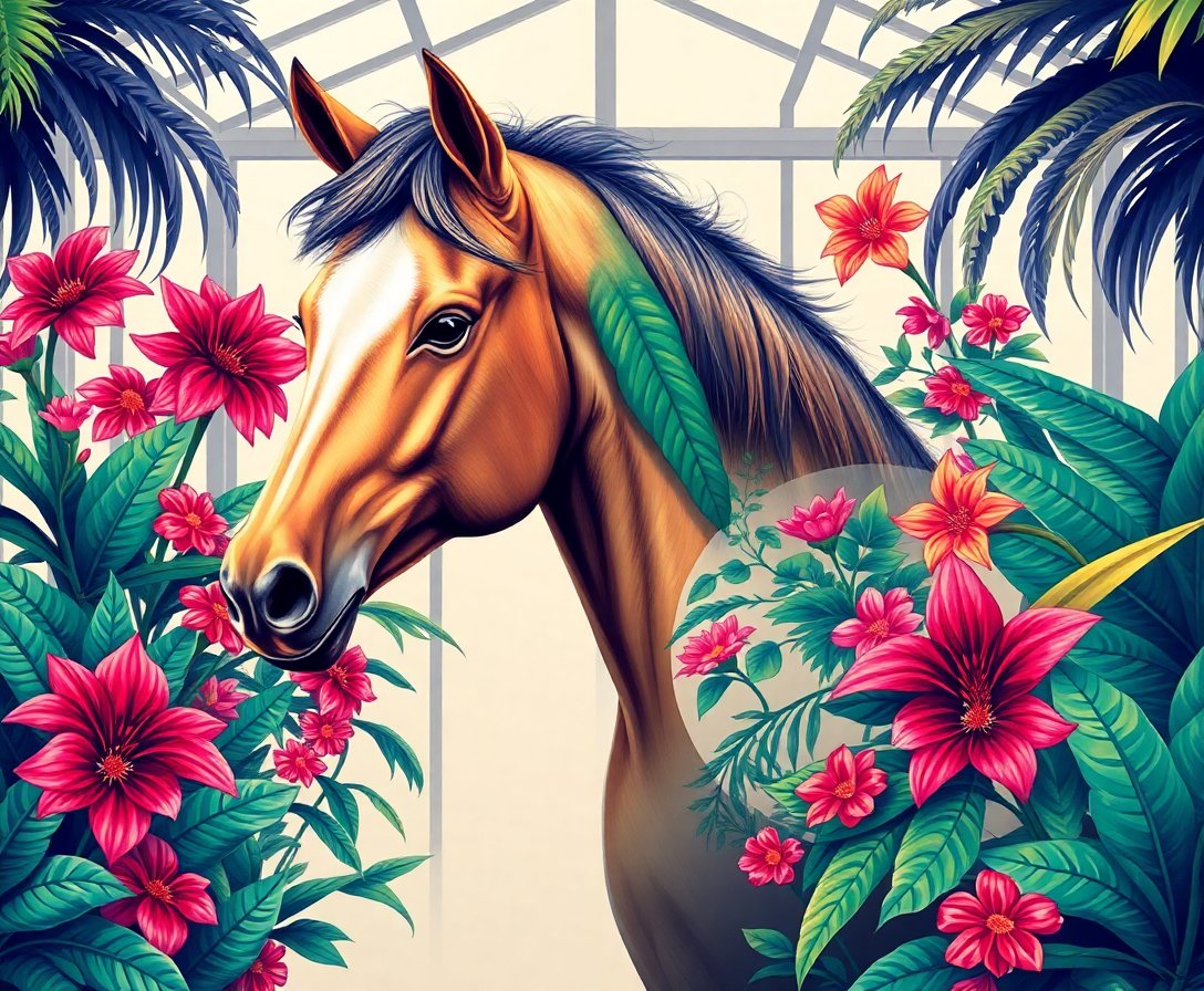 Ultimately, step back and admire your finished tropical stallion masterpiece. The vibrant botanical elements complement the majestic horse beautifully. Therefore, your creation becomes a stunning focal point for any room.