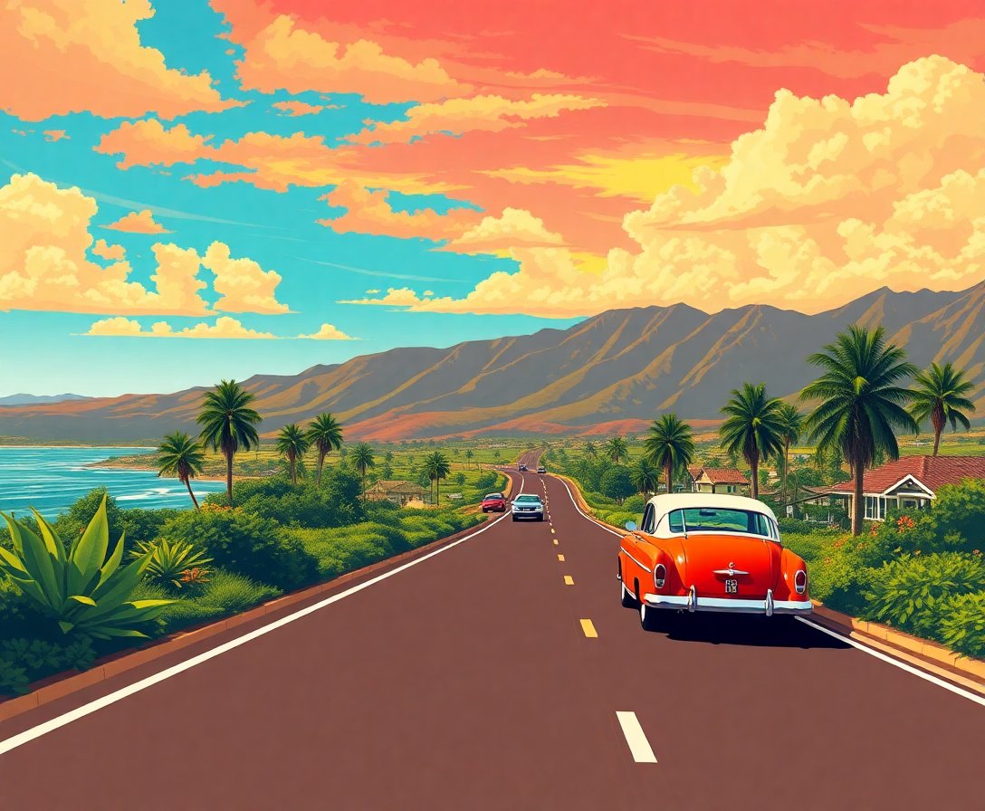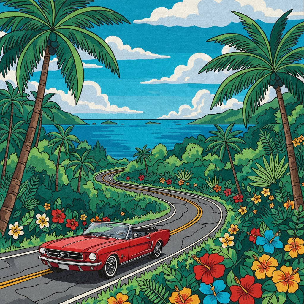 Ultimately, step back and admire your finished tropical highway scene. The vintage aesthetics bring timeless charm to any room. Your completed masterpiece showcases lush greenery and classic convertible charm perfectly.
