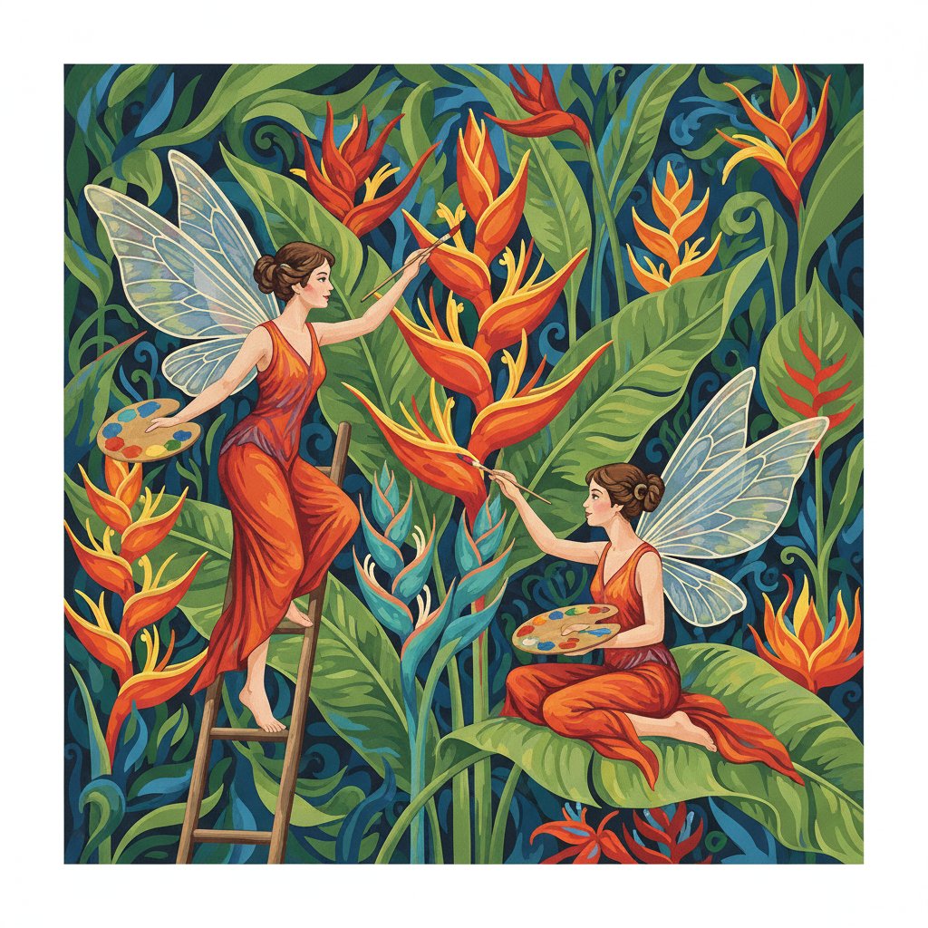 Ultimately, step back and admire your completed Victorian masterpiece. Moreover, the crimson heliconias and delicate fairies create magical wall art. Additionally, your finished painting brings botanical beauty into any room.
