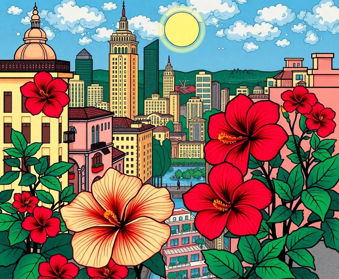 Ultimately, step back and admire your completed masterpiece displaying vibrant hibiscus blooms against the nostalgic city backdrop. Therefore, your finished painting becomes a stunning focal point worthy of prominent display.