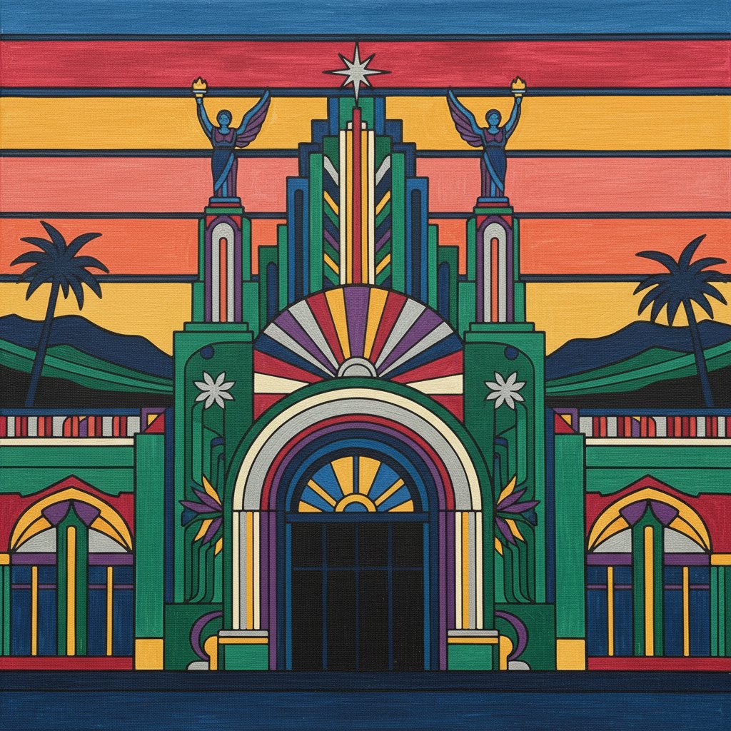This design captures authentic Art Deco architectural details with carefully selected pastel colors that reflect the sophisticated elegance of vintage Hollywood cinema.
