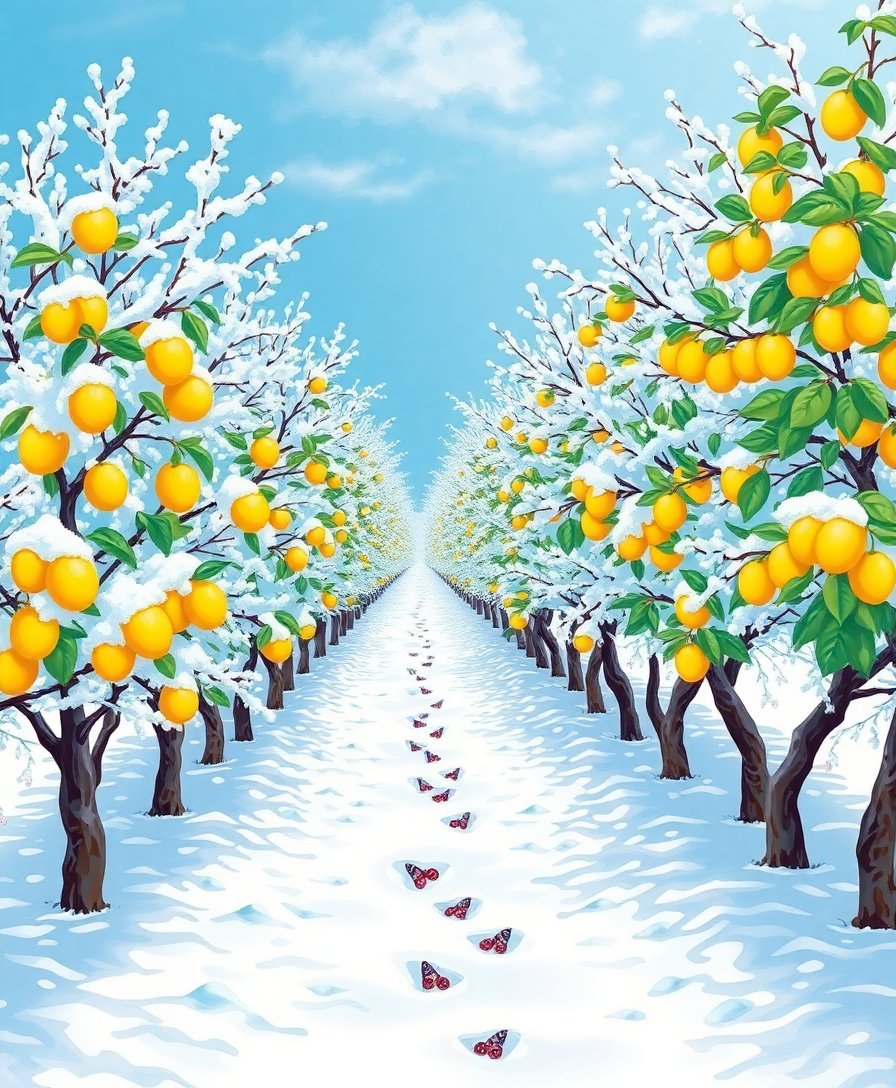 The nostalgic winter theme combines frosty atmosphere with charming lemon trees, creating a unique seasonal artwork. The vintage aesthetic appeals to those who appreciate timeless, elegant home decor.