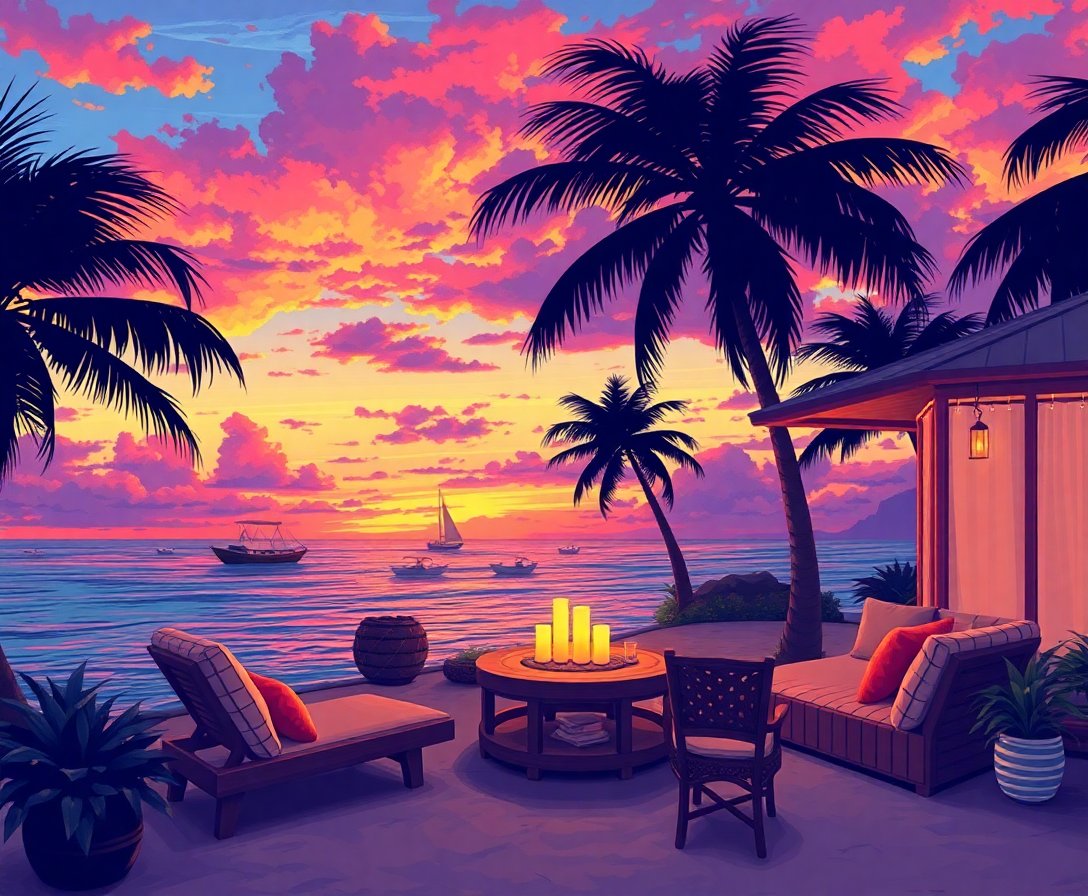 The nostalgic firelight and dusk atmosphere create a uniquely calming scene that captures the essence of tropical island evenings. The vintage aesthetic adds timeless charm to any space.