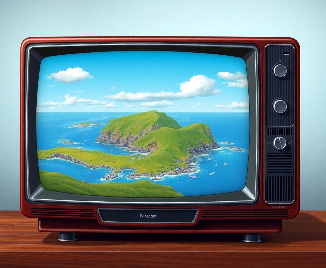Ultimately, add final details with the small brush for precision work. Complete the realistic CRT screen texture and weather symbols. Your finished piece will showcase Cuba’s coastline exactly as vintage meteorologists once presented it on classic television broadcasts.