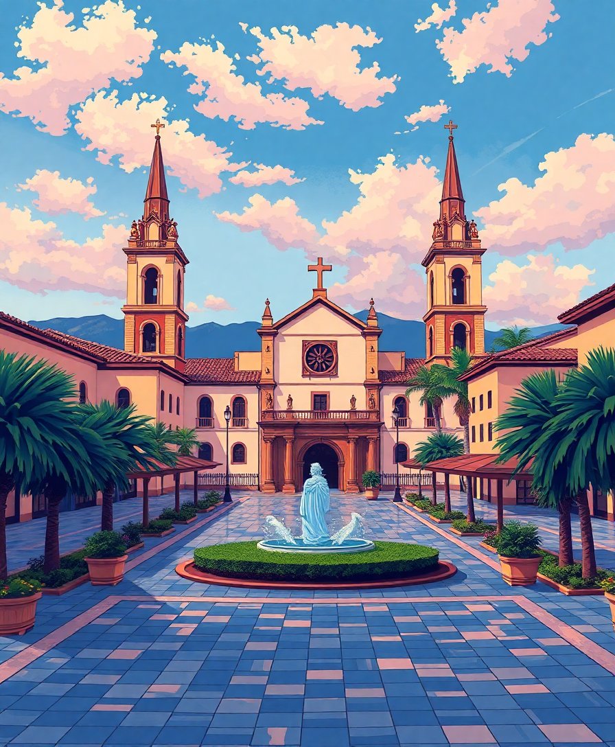 Ultimately, add the final details that bring the plaza to life. Step back and admire your completed mission church painting. The finished piece radiates the warm, nostalgic atmosphere of vintage tropical architecture.