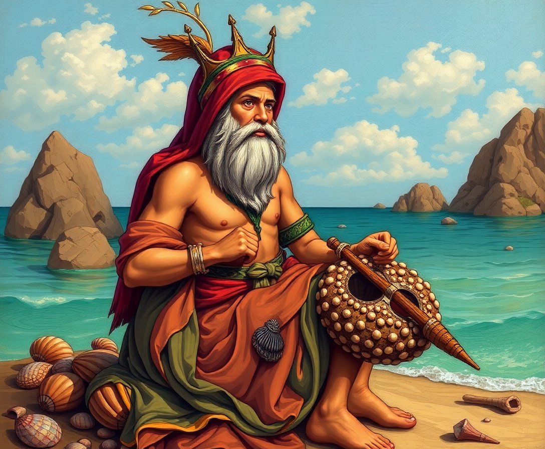 The unique combination of classical portraiture with tropical shell elements creates a distinctive vintage aesthetic. The sepia tone palette adds nostalgic charm while maintaining artistic sophistication.