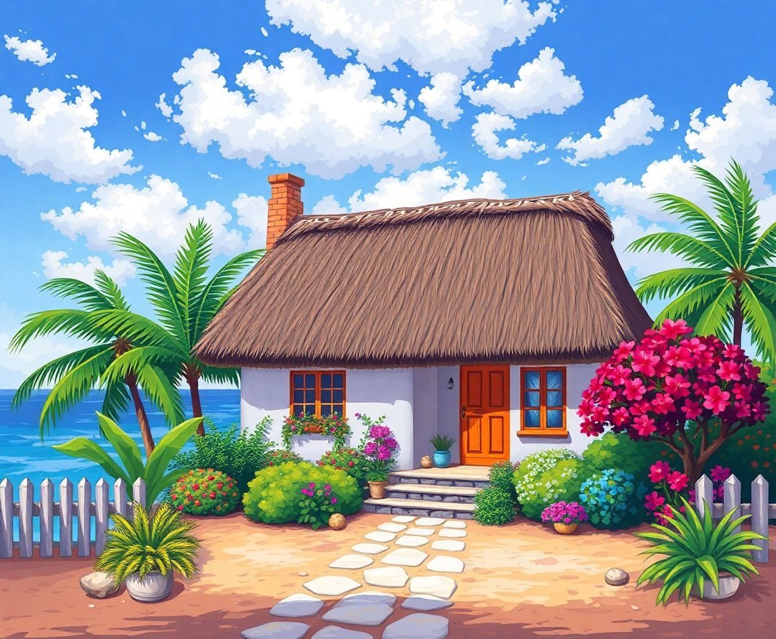 Transform your creative space with this enchanting Vintage Island Thatch Cottage Paint By Numbers masterpiece. This nostalgic design captures the timeless charm of whitewashed coastal cottages. Additionally, the sepia-toned palette creates an authentic vintage atmosphere perfect for any home.