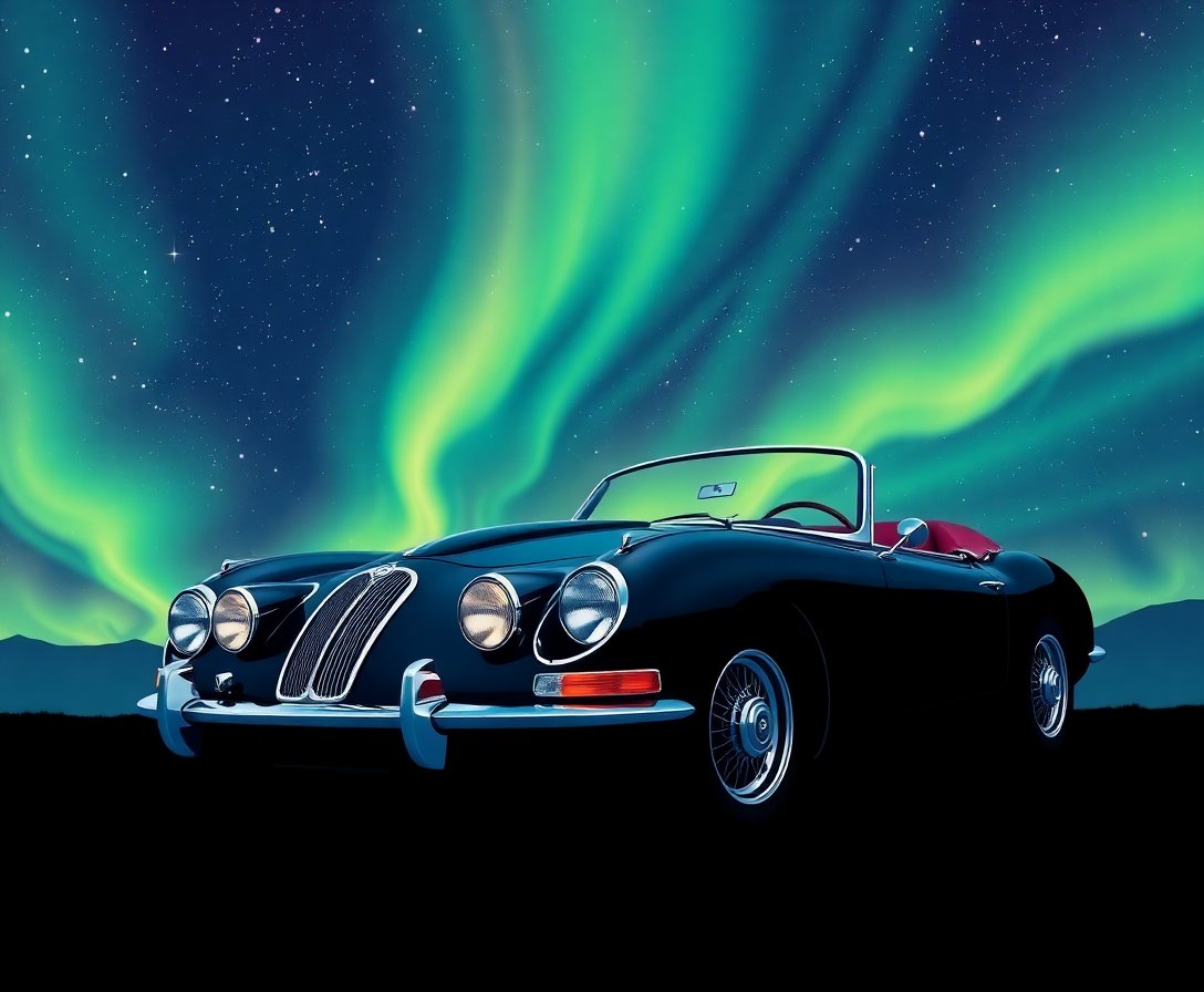 Ultimately, step back and admire your finished nocturnal masterpiece. The vintage jaguar stands majestically against the dancing green aurora, creating a captivating focal point for any room.