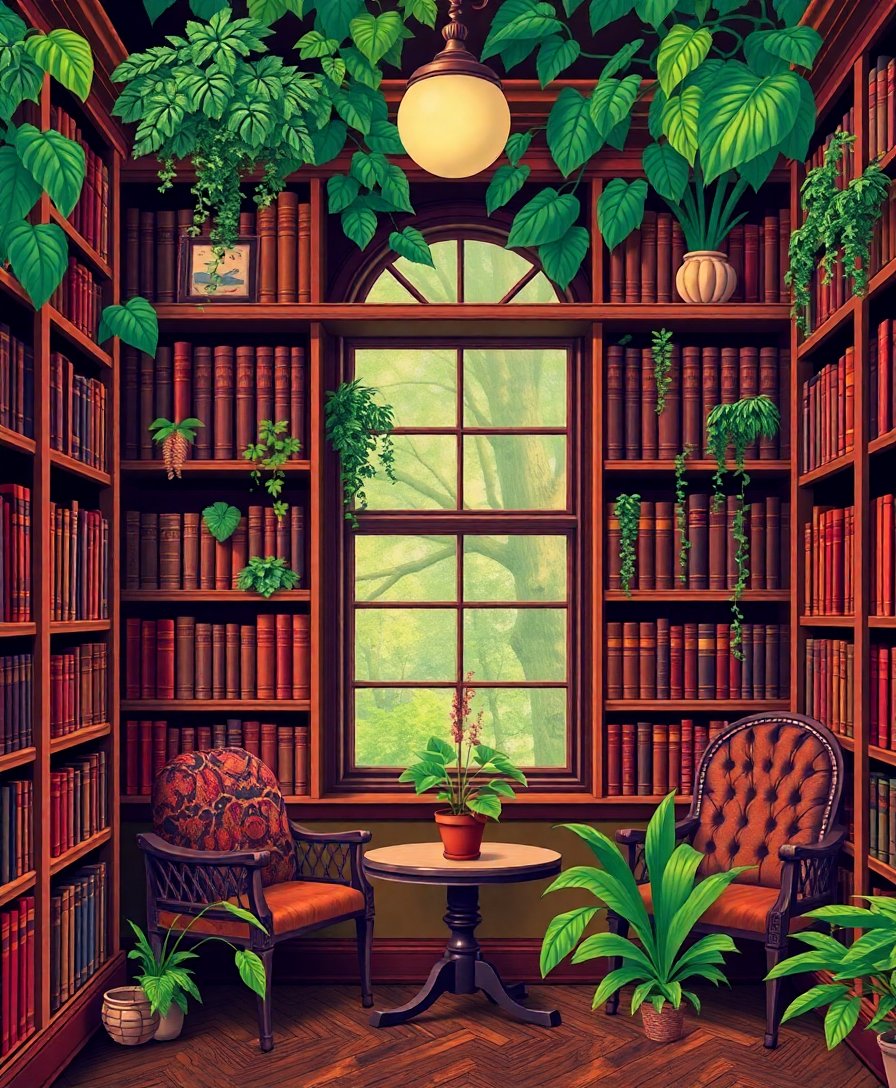 Ultimately, step back and admire your finished masterpiece showcasing rich mahogany and lush greenery. Your completed artwork captures the essence of a vintage library sanctuary. Display your creation proudly in any room seeking sophisticated charm.