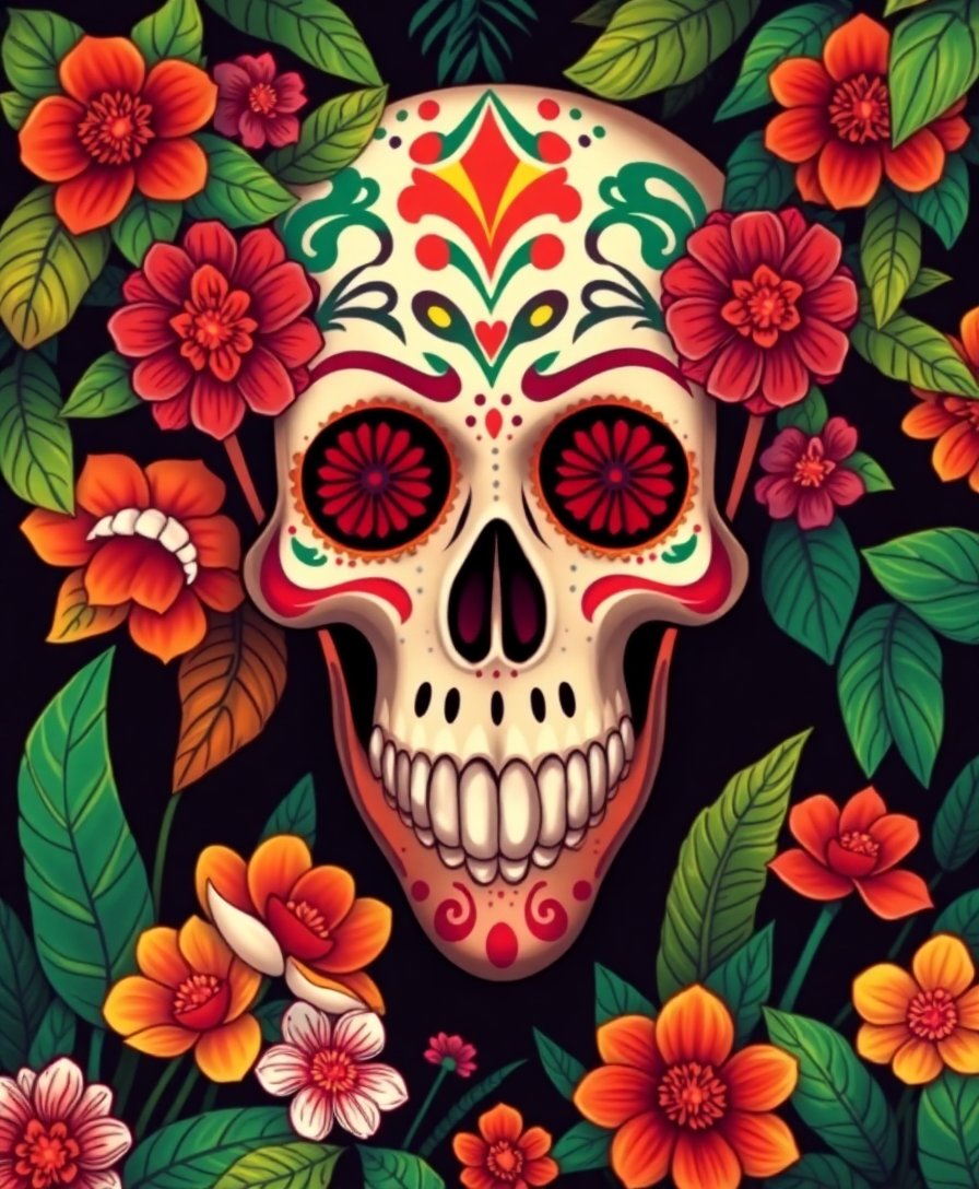 Ultimately, step back and admire your completed calavera masterpiece. Additionally, the jungle elements and vintage styling create stunning visual impact. Furthermore, your finished artwork celebrates cultural heritage beautifully.
