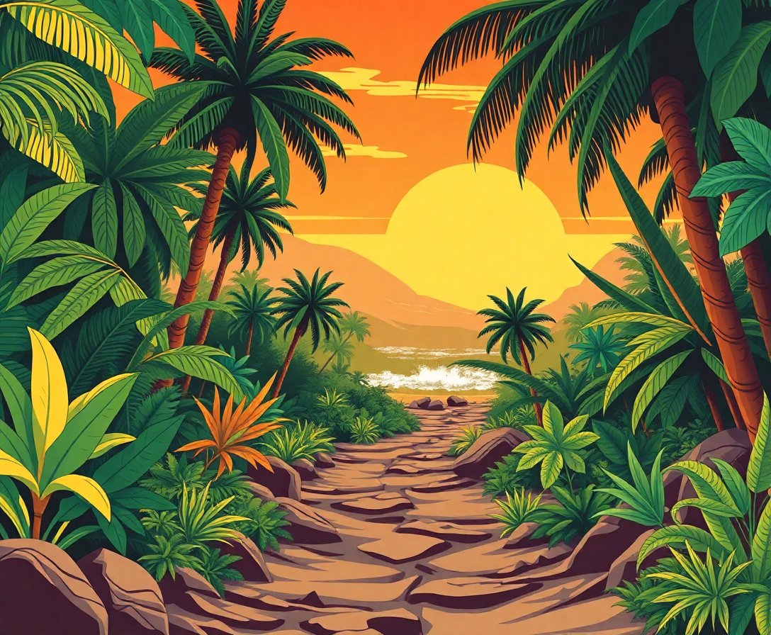 The vintage jungle surf trail combines nostalgic retro elements with lush green pathway scenery. This unique blend captures both tropical paradise and classic surf culture aesthetics.