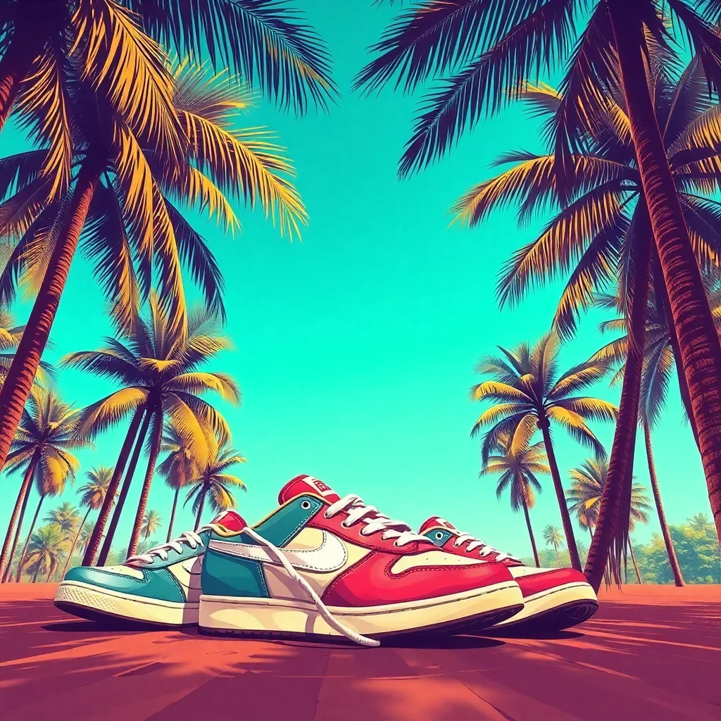 This design perfectly captures retro sneaker culture with tropical beach elements. The nostalgic theme combines vintage kicks with palm shadows for a unique artistic experience.