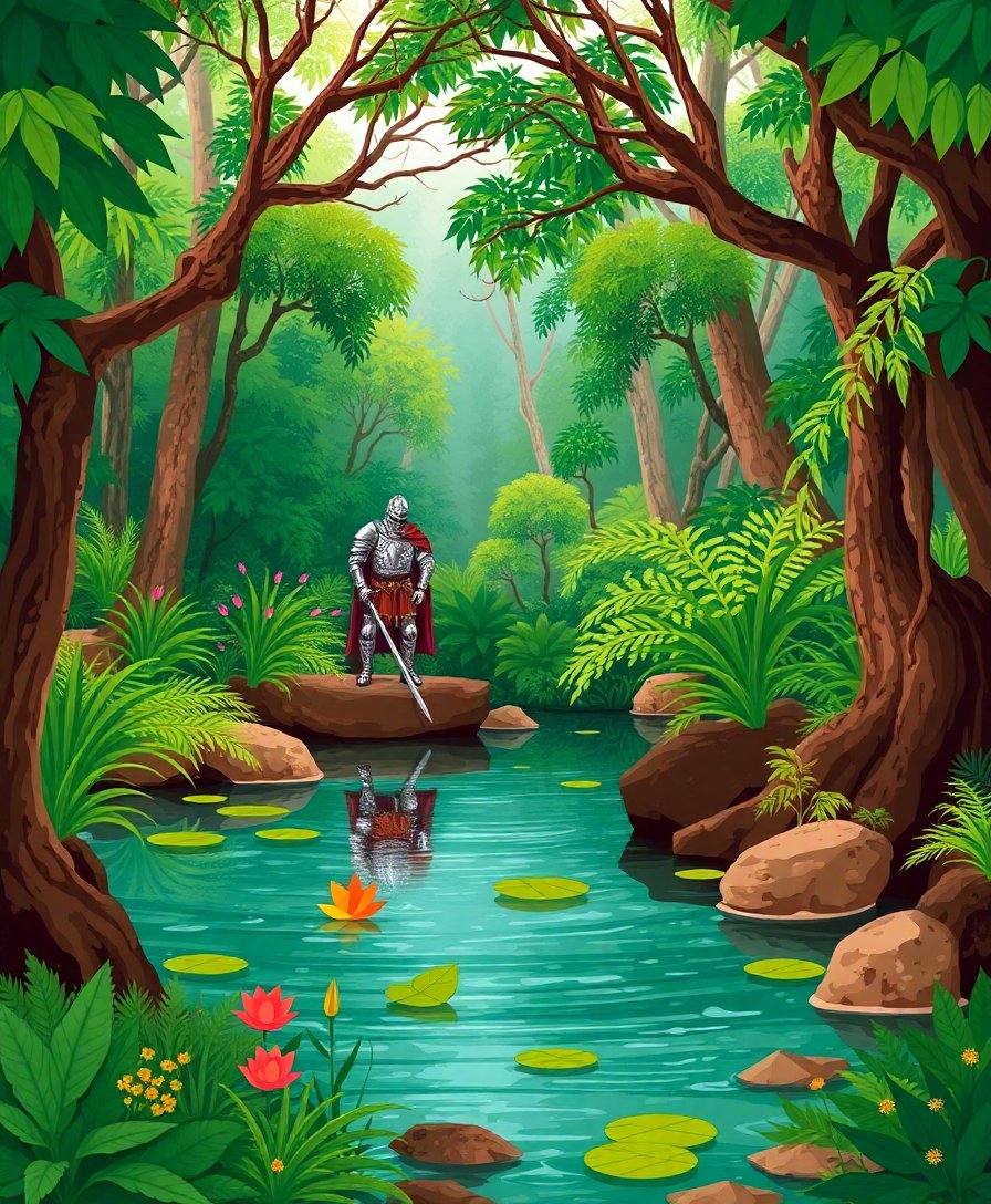 Ultimately, complete the final details of Lancelot’s armor and the surrounding jungle foliage. Additionally, step back to admire your finished masterpiece capturing this legendary knight’s moment of reflection. Moreover, your completed artwork becomes a stunning tribute to Arthurian legend.