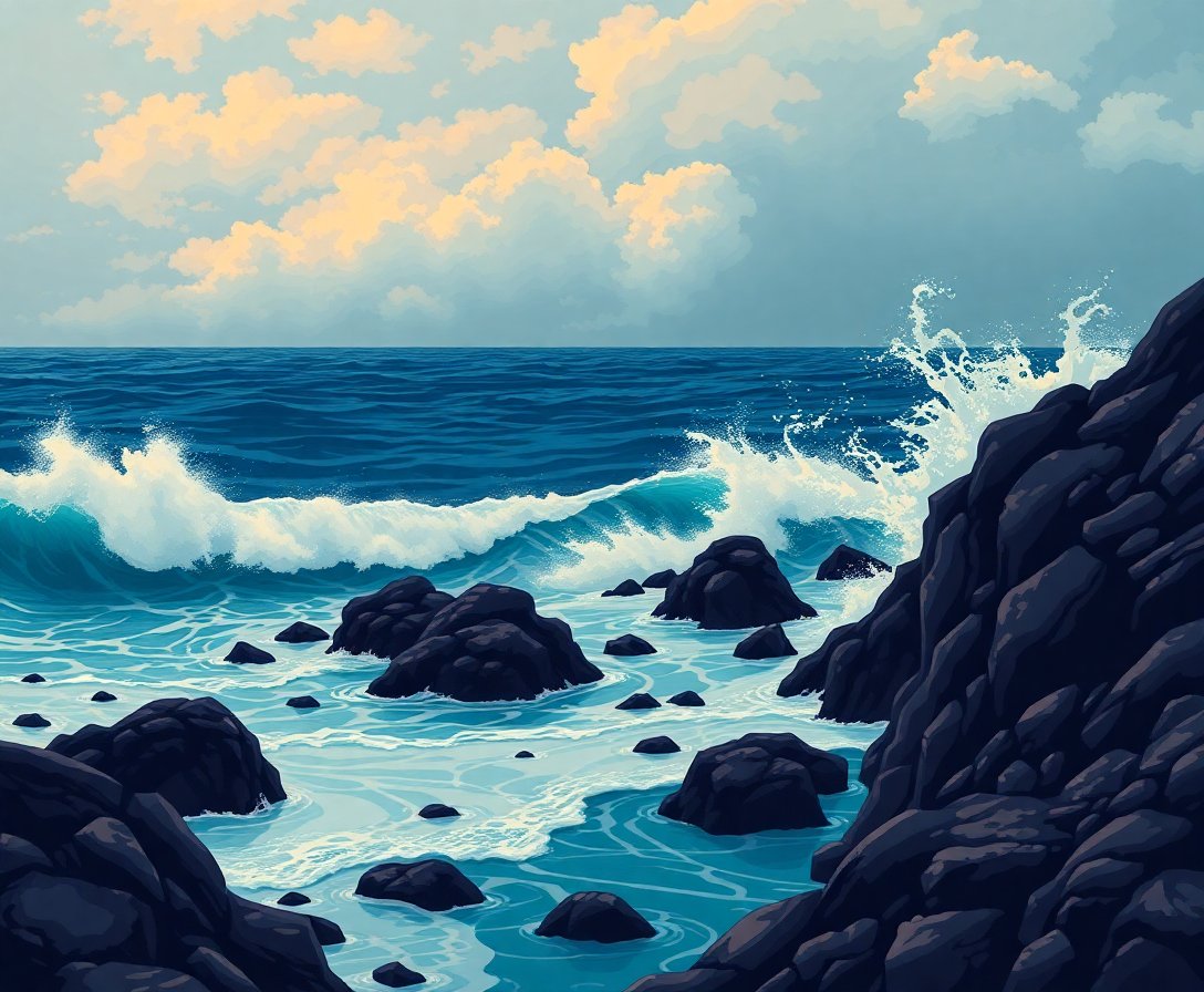 Ultimately, step back and admire your completed vintage coastal masterpiece. The final artwork showcases dramatic wave action against volcanic rock formations. Furthermore, the finished piece becomes a stunning focal point for any room.