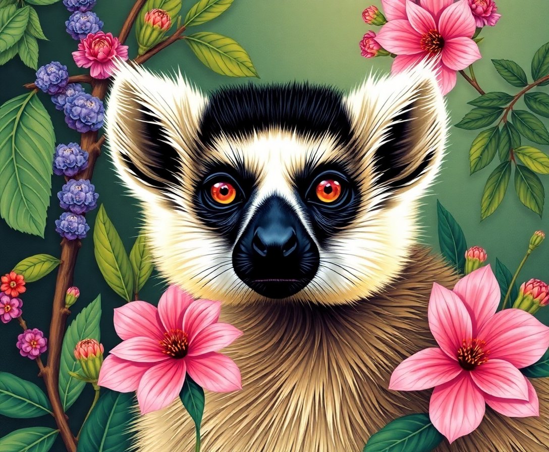 Ultimately, add final details and highlights to bring your lemur portrait to life. Allow proper drying time between layers. Your finished piece will showcase beautiful botanical artistry ready for display.