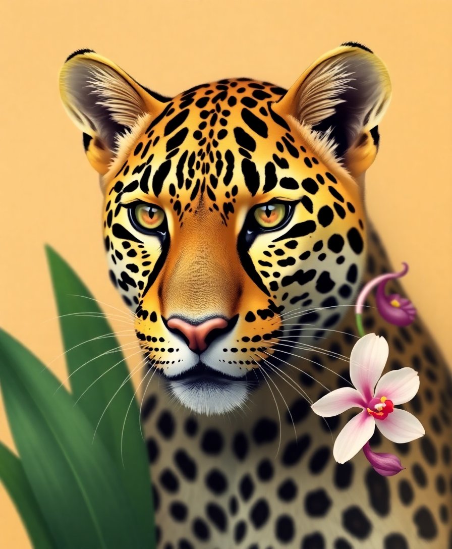 Ultimately, refine the final highlights and let your artwork dry fully. Then step back and admire the realistic leopard, framed by graceful orchids. You can display your creative masterpiece in a hallway or studio corner to inspire future projects and quiet reflection.
