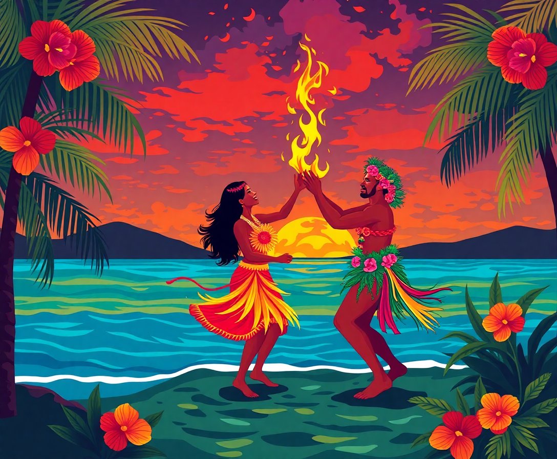 Ultimately, step back and admire your completed Hawaiian fire dance scene. The vibrant flames and traditional dancers create a stunning focal point. Your finished artwork celebrates the spirit of Polynesian culture magnificently.