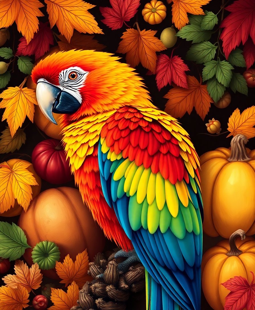 Premium linen canvas ensures professional results and durability. Meanwhile, carefully curated autumn colors capture seasonal beauty perfectly. Additionally, the scarlet macaw design combines wildlife artistry with harvest traditions. Subsequently, this creates meaningful holiday artwork for grateful celebrations.