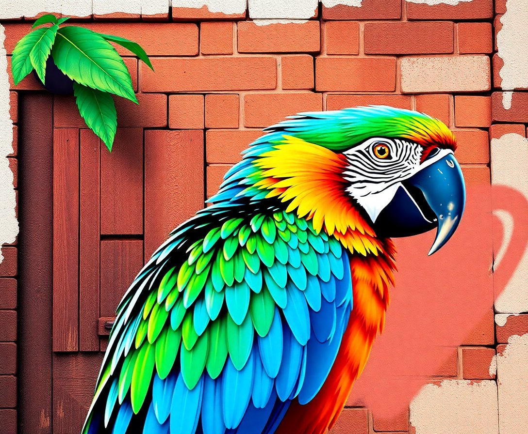 Ultimately, step back and admire your completed masterpiece. The weathered textures and vibrant macaw colors create stunning visual impact. Your street art creation is ready for display.