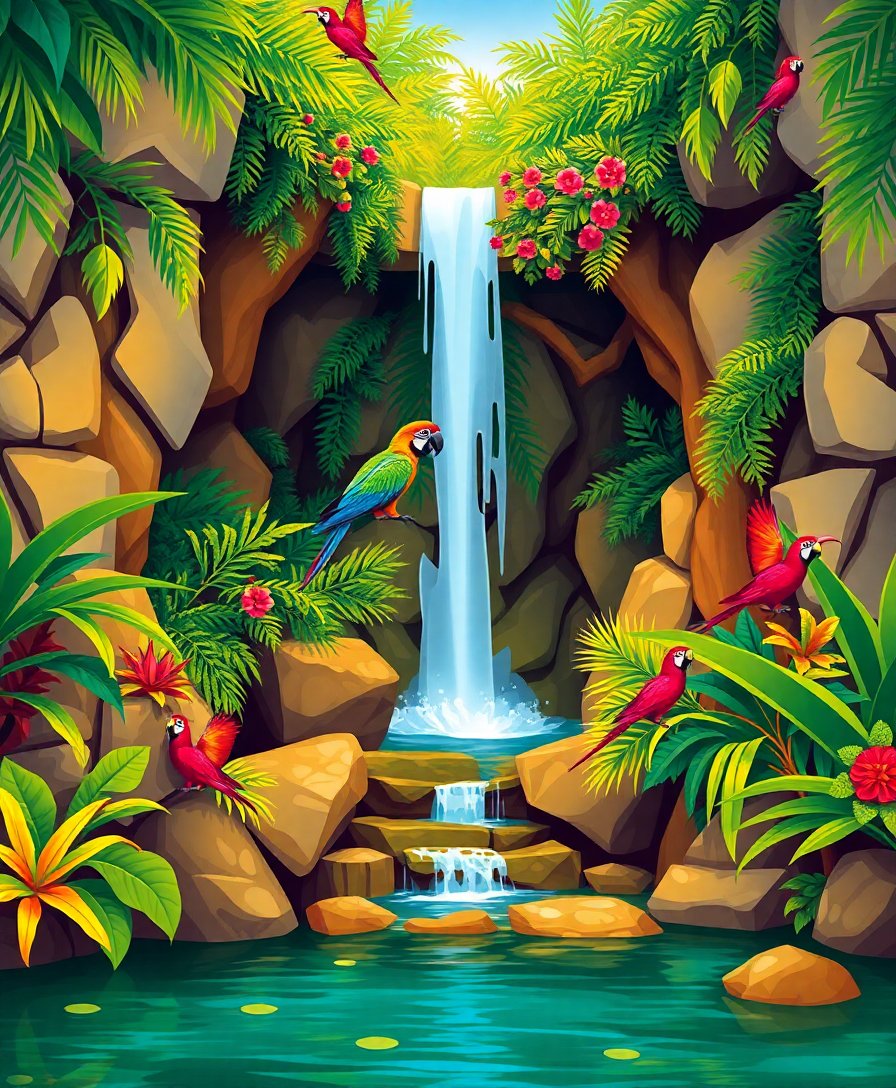 Ultimately, add final details to bring your oasis to life. Watch as vibrant macaws emerge against the tropical waterfall backdrop. Your completed masterpiece radiates vintage charm and natural beauty.