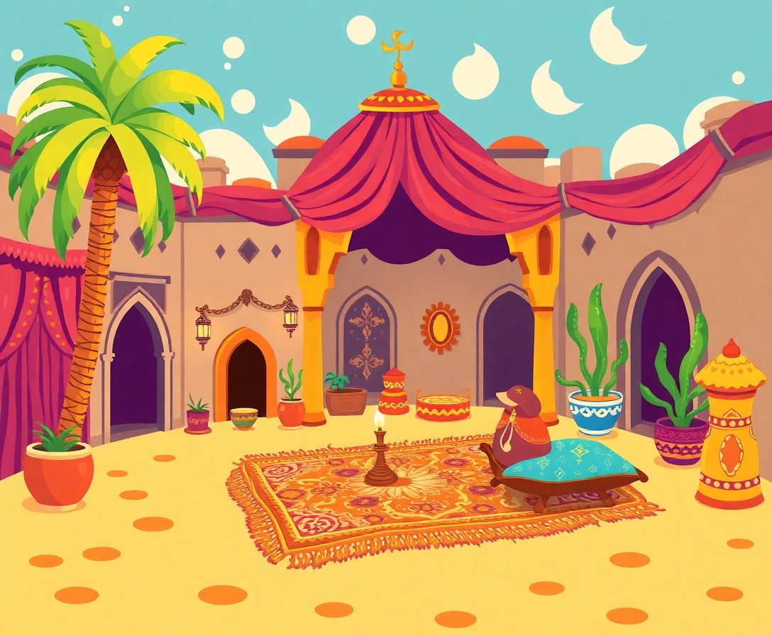 Ultimately, step back and admire your completed masterpiece. The lush tropical elements and mystical carpet design create a captivating focal point. Your finished artwork radiates the enchanting beauty of ancient Arabian tales.