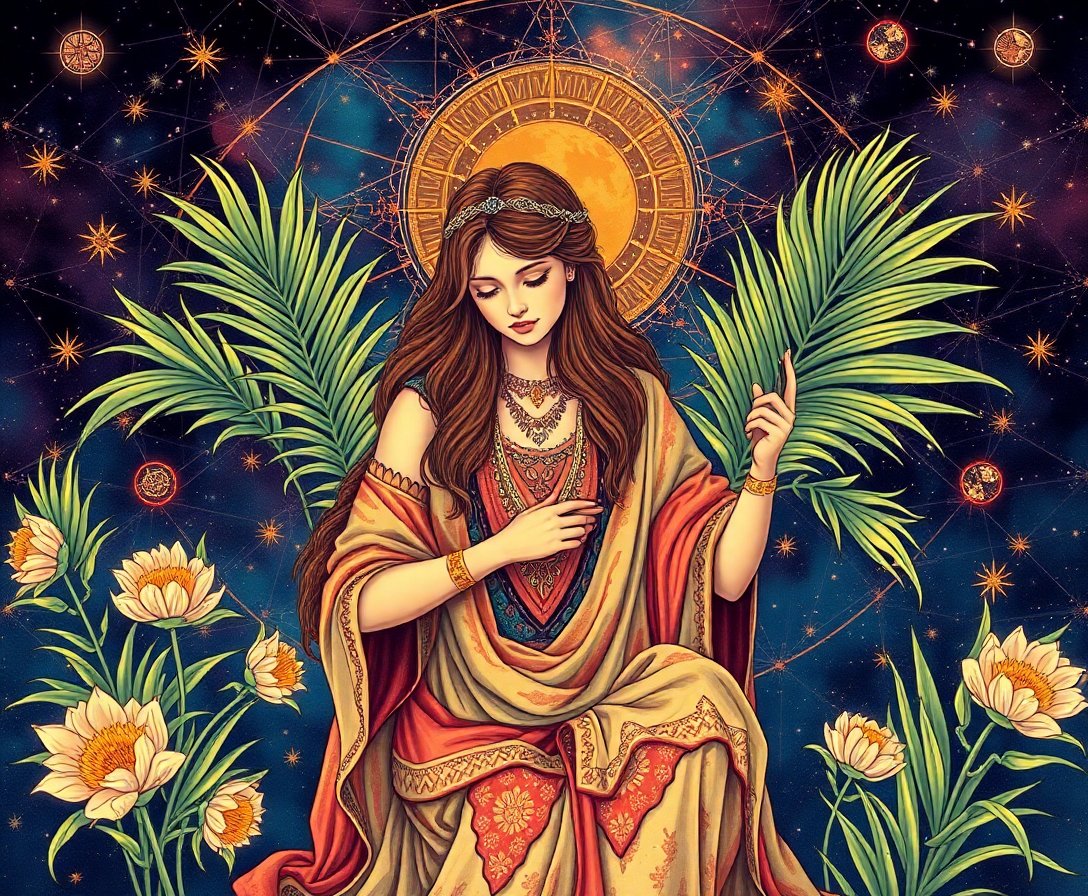 The sepia tones and mystical maiden theme create a timeless aesthetic that complements any decor. The intricate palm weaving details provide an engaging artistic challenge.