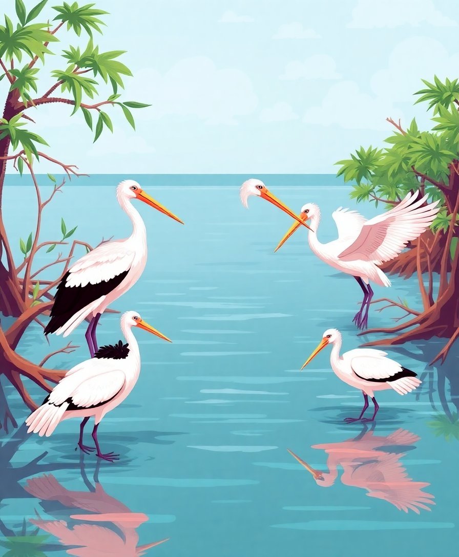 The muted pink palette and ornithological subject matter create a sophisticated vintage aesthetic. The mangrove setting showcases these magnificent birds in their natural wetland habitat.