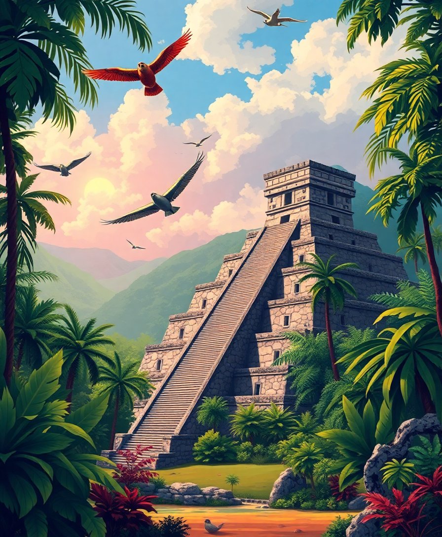 Ultimately, step back and admire your completed masterpiece. The realistic parrots and detailed Mayan architecture create stunning visual depth. Your artistic journey culminates in a breathtaking representation of pre-Columbian splendor.