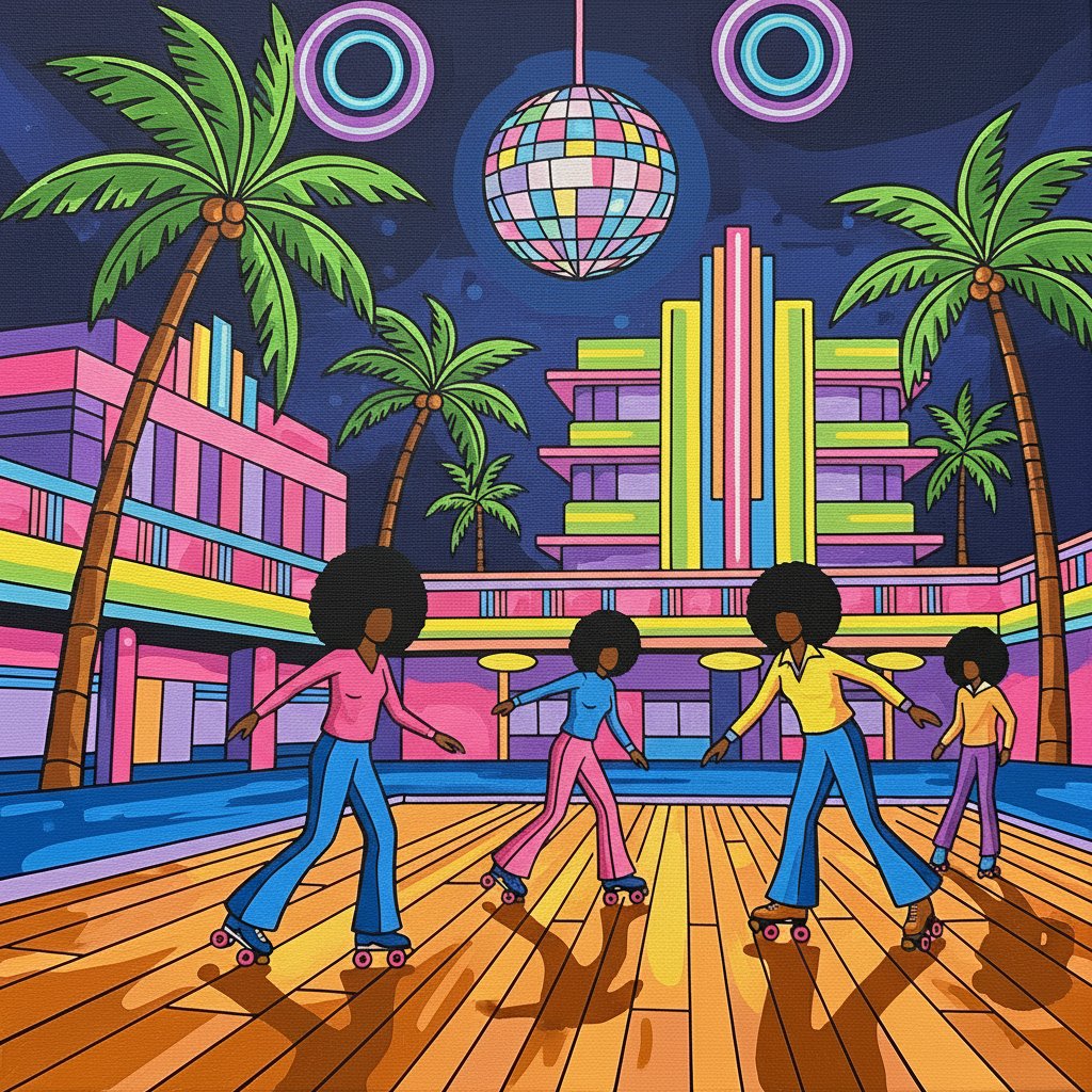 Ultimately, step back and admire your finished retro masterpiece. Consequently, you’ll have created a stunning tribute to roller disco culture. Finally, hang your completed artwork to showcase this vibrant slice of Miami nostalgia.